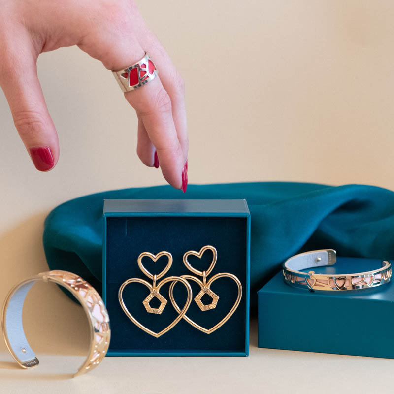 Prêts à porter et à associer, nos bijoux intemporels peuvent être assemblés avec nos bijoux personnalisables. Démonstration ici, avec les boucles d'oreilles Girafe Cœur à porter avec la bague et les manchettes Cœur (en mixant le doré et l'argenté), à personnaliser avec les cuirs réversibles Rose Clair / Gris Clair et Rouge / Paillettes Noires. Alors, votre verdict ?
